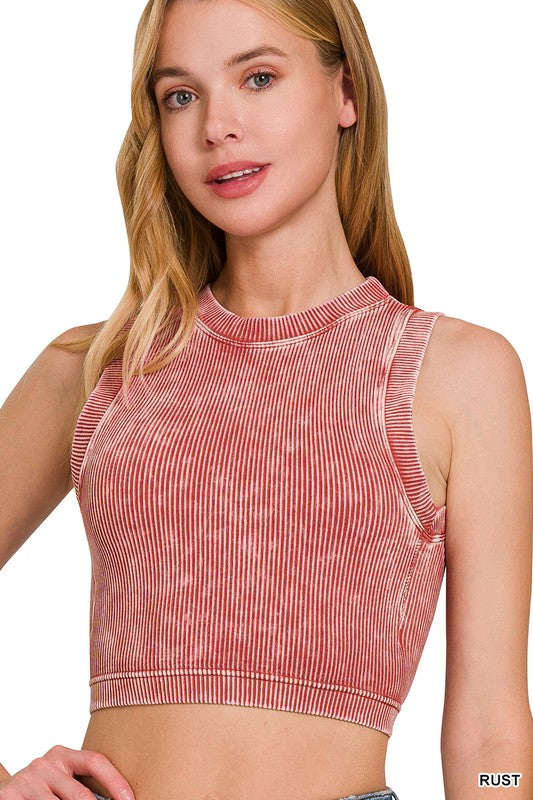 Zenana Stone Washed Ribbed Crop Top with Bra Padding